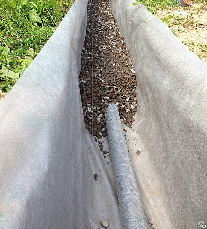 Высоким стандартом можно назвать наличие цепочки труб дренажа, размещенных в подсыпке внутри траншеи. Однако ввиду того что дренажный слой может со временем заиливаться, его нужно отделить от основного шара грунта. Как раз для этих целей используется геоткань. Она пропускает влагу, но не дает дренажу забиваться.