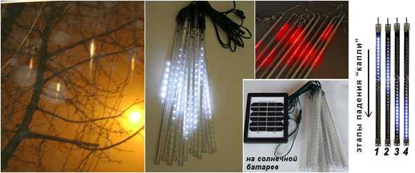 Π’Π°ΡΡΠΈΠ΅ ΡΠΎΡΡΠ»ΡΠΊΠΈ (Ice Drop Light, Meteor Light ΠΈΠ»ΠΈ Snowfall Light) β ΡΡΠΎ ΡΠ²Π΅ΡΠΎΠ΄ΠΈΠ½Π°ΠΌΠΈΡΠ΅ΡΠΊΠ°Ρ Π³ΠΈΡΠ»ΡΠ½Π΄Π° Π² Π²ΠΈΠ΄Π΅ ΠΏΡΠΎΠ·ΡΠ°ΡΠ½ΠΎΠΉ ΠΏΠ»Π°ΡΡΠΈΠΊΠΎΠ²ΠΎΠΉ ΡΡΡΠ±ΠΊΠΈ Π΄Π»ΠΈΠ½ΠΎΠΉ Π΄ΠΎ 1 ΠΌΠ΅ΡΡΠ°, Π²Π½ΡΡΡΠΈ ΠΊΠΎΡΠΎΡΠΎΠΉ Π½Π°Ρ ΠΎΠ΄ΠΈΡΡΡ ΡΠ½ΡΡ Π΄ΡΡΠ°Π»Π°ΠΉΡ. ΠΠΎ Π²ΡΠ΅ΠΌΡ ΡΠ°Π±ΠΎΡΡ ΠΈΡΡΠΎΡΠ½ΠΈΠΊΠΈ ΡΠ²Π΅ΡΠ° Π½Π°ΡΠΈΠ½Π°Ρ Ρ Π²Π΅ΡΡ Π½Π΅Π³ΠΎ Π²ΠΊΠ»ΡΡΠ°ΡΡΡΡ ΠΈ Π³Π°ΡΠ½ΡΡ ΠΏΠΎΠΎΡΠ΅ΡΠ΅Π΄Π½ΠΎ, ΡΠΎΠ·Π΄Π°Π²Π°Ρ ΡΠ°ΠΊΠΈΠΌ ΠΎΠ±ΡΠ°Π·ΠΎΠΌ ΡΡΡΠ΅ΠΊΡ ΡΡΠ΅ΠΊΠ°ΡΡΠ΅ΠΉ Π²Π΄ΠΎΠ»Ρ ΡΡΡΠ±ΠΊΠΈ ΠΊΠ°ΠΏΠ»ΠΈ ΡΠ²Π΅ΡΠ° ΠΏΠΎΠ΄ΠΎΠ±Π½ΠΎ ΡΠ°ΡΡΠΈΠΌ ΡΠΎΡΡΠ»ΡΠΊΠ°ΠΌ, ΠΏΡΠΎΠ»Π΅ΡΠ°ΡΡΠ΅ΠΌΡ Π² Π½Π΅Π±Π΅ ΠΌΠ΅ΡΠ΅ΠΎΡΡ ΠΈΠ»ΠΈ ΠΏΠ°Π΄Π°ΡΡΠ΅ΠΌΡ ΡΠ½Π΅Π³Ρ.