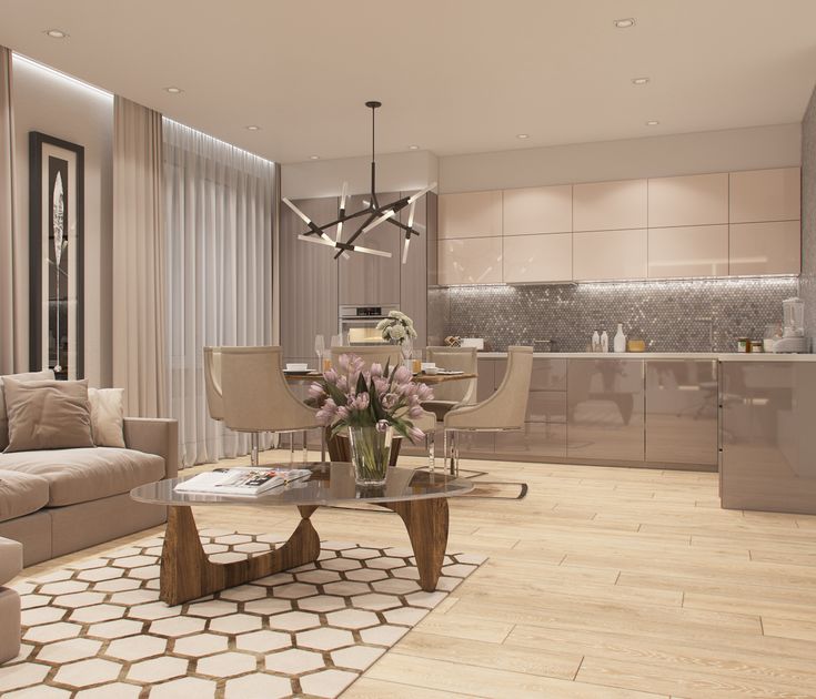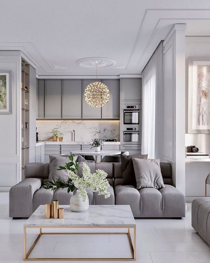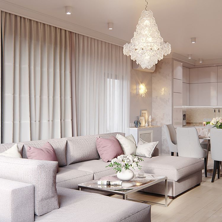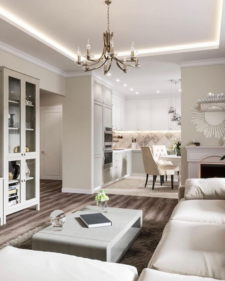 Дизайн кухни-гостиной в классика в светлых тонах 30 кв.