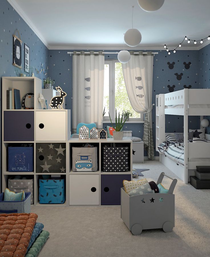 Основное в данном вопросе – квадратура. Если она совсем небольшая, стоит установить кровать из двух ярусов, один письменный стол (причем какой-то эргономичный), ну и шкаф также нужно будет ставить один, условно поделив его на пополам.