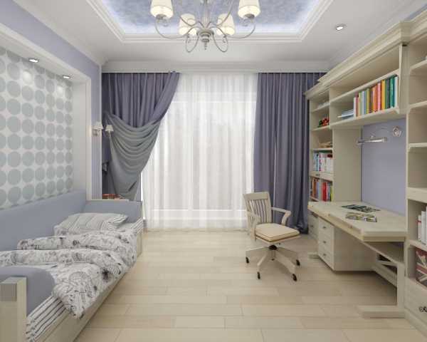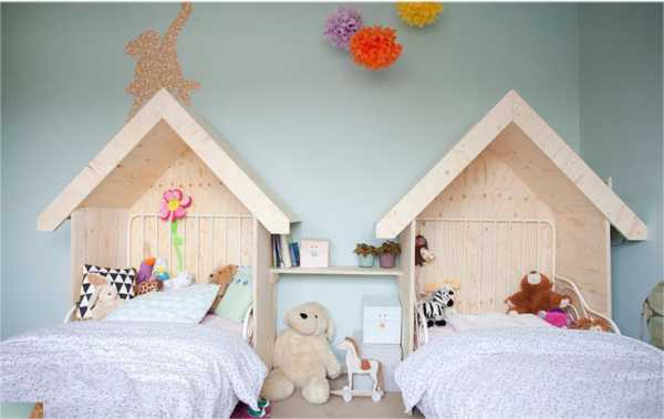 В квадратной комнате кроватки устанавливают вдоль двух противоположных стен или в дальнем углу комнаты. В прямоугольном помещении ложа можно установить «паровозиком» вдоль длинной стены или перпендикулярно ей. Интересным решением выступает организация высокого подиума с выкатными кроватями. В таком случае, на подиуме обустраивается учебная территория с двумя письменными столами, а оставшаяся площадь комнаты оборудуется под игровую.