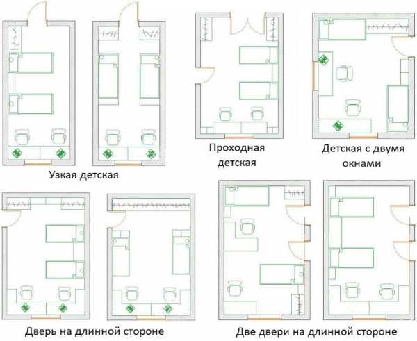 Существует несколько вариантов размещения мебели с учетом возраста детей, размеров и формы комнаты, расположения окон и дверей. Как правило, расстановка мебели начинается с определения мест для кроватей