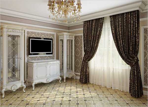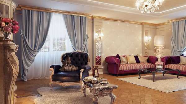 Классический дизайн гостиной предполагает большое количество текстиля – дорогие ковры, тяжёлые шторы с эффектной драпировкой.