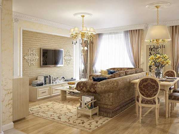 Классический дизайн гостиной создаёт уютную обстановку без кричащих акцентов, располагающую к отдыху и общению. Для сторонников традиционных направлений такой интерьер будет самым лучшим вариантом.