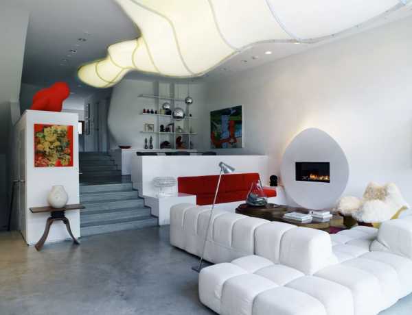 Из элементов обстановки в интерьере гостиной комнаты приоритет остается за приземистой мягкой мебелью в белой обивке, которую отлично дополнит журнальный столик, удерживающий на серых ножках снежно белую столешницу. В изгибе использованной полки достаточно места для размещения масштабной плазменной панели.