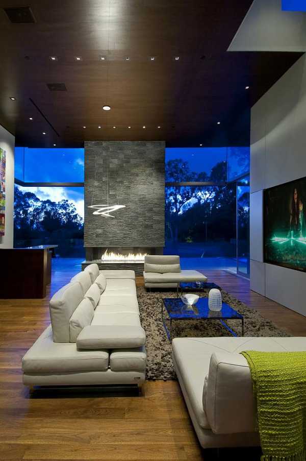 На пол при таком дизайне интерьера гостиной в этом случае кладут темно-серую с глянцевым блеском плитку, а потолок делают в контрастном белом цвете фактурной штукатуркой.
