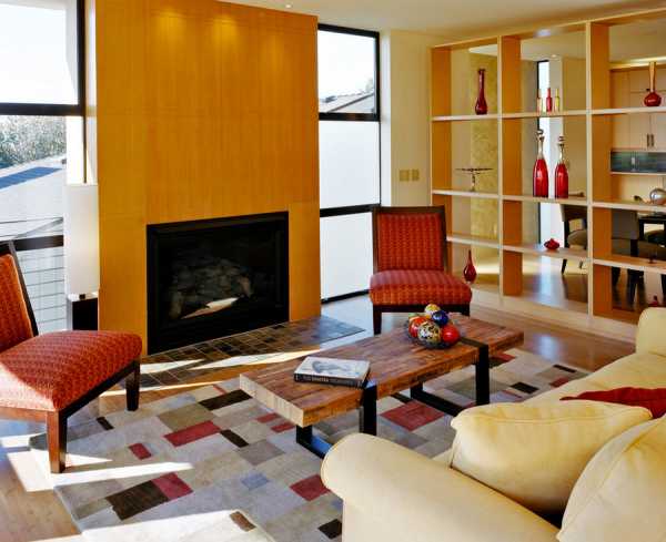 Пол покрывается красным ковролином, поверх которого, для выделения уголка отдыха, может быть положен небольшой коврик или циновка в характерном общему стилю оформления гостиной дизайне.