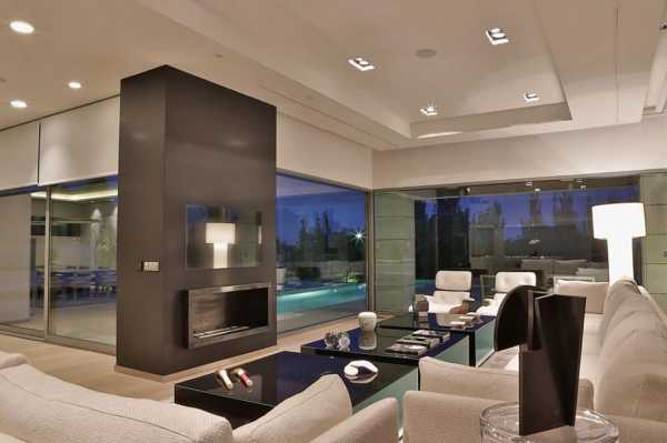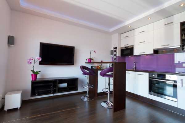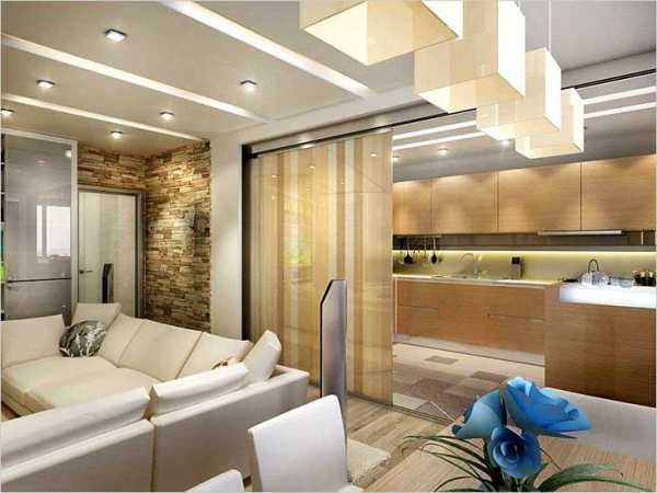 Часто используются ниши и перегородки, разделяющие пространство на функциональные зоны, подсветка.