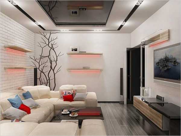 Подчеркнуть нестандартность оформления гостиной в квартире поможет одиозная подсветка.