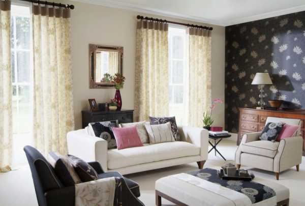 Шторы для гостиной лучше выбирать однотонные. Модели с цветами или яркими узорами более уместны на кухне. Шикарно смотрятся ламбрекены, правда они подходят для помещений с высокими потолками. Выбирайте светлые однотонные оттенки, так как они сделают комнату более уютной и элегантной. Если все-таки хочется сакцентировать внимание на шторах, можете выбрать модели более ярких тонов, только тогда для контраста придется использовать мебель бежевого или белого цвета.