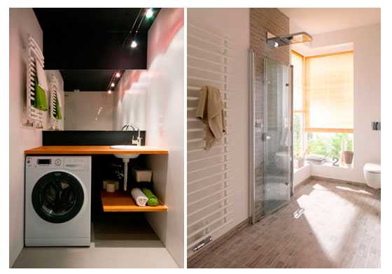 - Установите стиральную машину под раковиной. Чтобы совпасть по высоте предлагается два решения: приобрести более высокую столешницу на заказ или купить малогабаритную стиральную машину, не уступающую по вместительности.