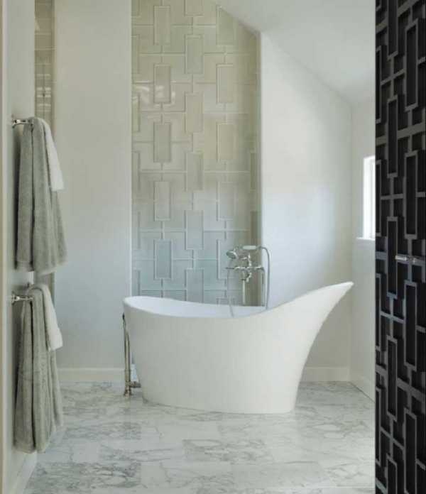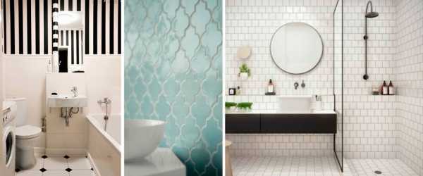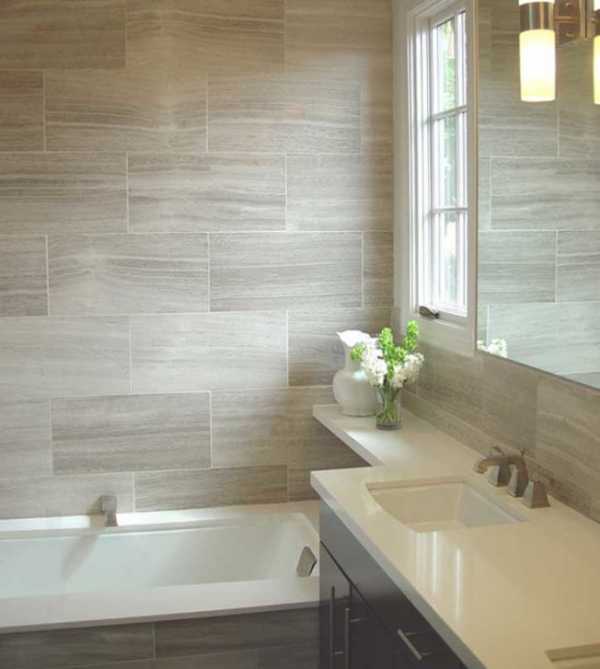 Прямоугольные формы желательно располагать горизонтально, потому что такое расположение плитки оптически «расширит» ванную и сделает ее визуально просторней.