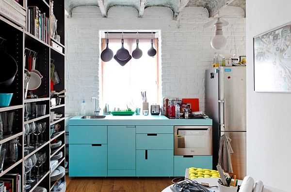 Голубая мебель в светлом интерьере малогабаритной квартиры