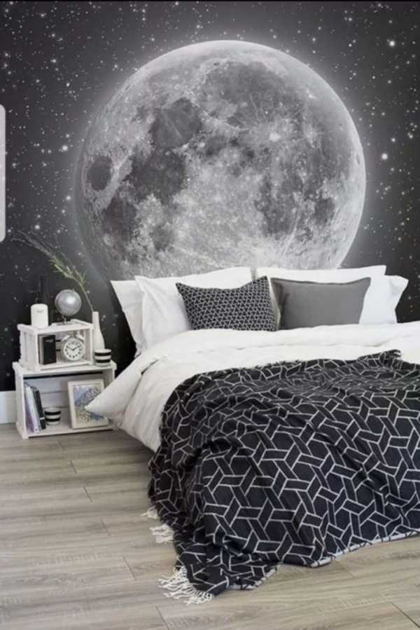 Акцентная стена всегда придаёт образу комнаты свежесть. Вариант может быть выполнен в тех же оттенках, что и другие стены, однако украсить его можно нестандартным рисунком.