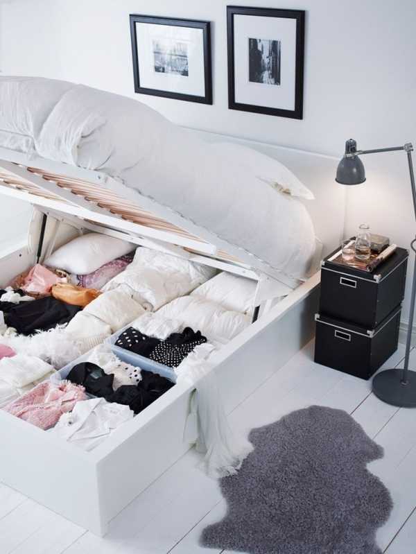Под кроватью можно разместить дополнительные ящики для хранения вещей в качестве экономии пространства. К тому же это даст возможность выполнить интерьер в минималистических тонах.