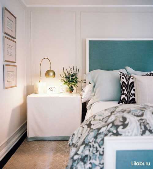 Кровать — самое главное место в интерьере спальни. Как правило, в небольших помещениях она устанавливается в центре стены. Кровать может быть украшена мягким изголовьем. Красиво смотрятся симметричные прикроватные тумбочки. На одну из них можно установить светильник или цветок, положить пару книг, небольшую вазочку или статуэтку.