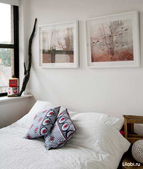 Часто для декора интерьера спальни дизайнеры используют картины (фото выше), постеры (фото ниже) и панно. Для спальни подойдут спокойные сюжеты: натюрморты, пейзажи или портреты. Лучшим вариантом станут картины с умиротворяющей атмосферой. Огромная картина в изголовье над кроватью может стать интересным акцентом помещения. Помните, что живопись должна подходить к интерьеру по стилю и цвету.