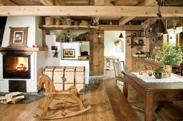 Вместо печи должен быть установлен камин, на котором будет удобно поджаривать кабанью ножку. Его следует облицевать диким камнем или плиткой его напоминающей.
