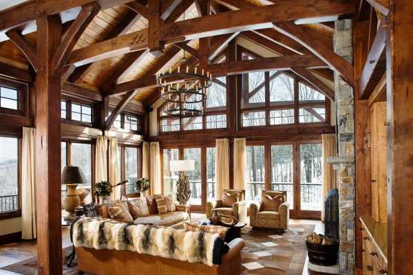 Один из наиболее редко используемых интерьеров деревянного дома. Это обусловлено с тем, что данный стиль гармонично смотрится лишь в помещениях с высоким потолком и большими комнатами. Но если при строительстве дома из бруса вы хотели именно такой интерьер, то не лишним будет использовать в сочетании с деревом некоторые современные материалы, как минимум установите пластиковые окна.