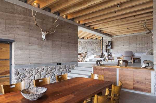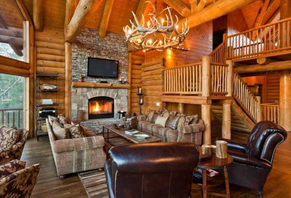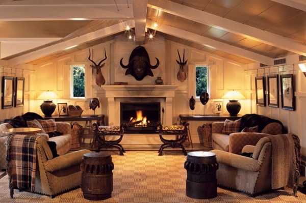 Чучела и шкуры животных являются неотъемлемым атрибутом такого жилища. Среди голов убитых «собственноручно» животных неплохо развесить декоративное или настоящее оружие, для этого подойдут как охотничьи ружья, так и клинки.