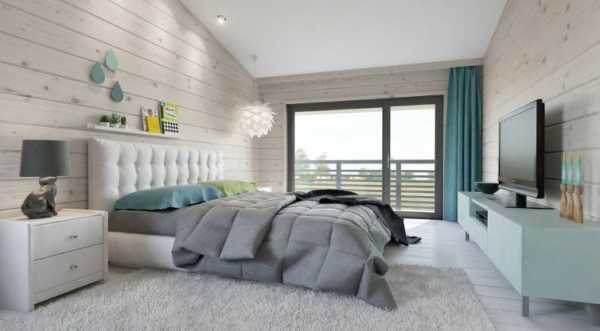 Дома из дерева не должны слишком пестрить изнутри, вся используемая цветовая гамма обычно однотонная. Однако включение пары ярких оттенков, может стать визитной карточкой вашего дома из бруса, как на фото ниже.