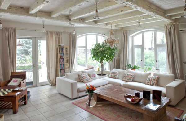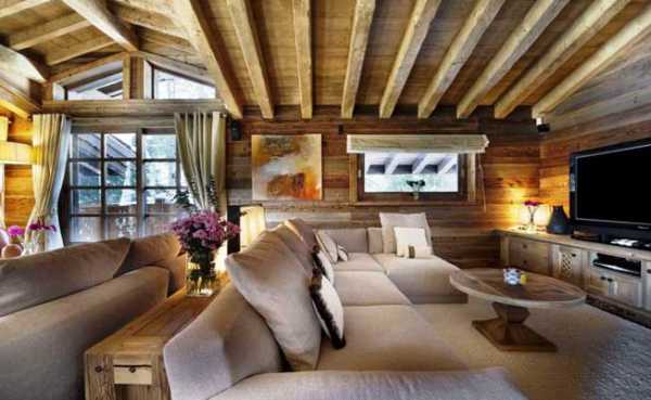 Внимание! В лучших интерьерах домов из бруса дизайн потолка – это несущие конструкции: балки перекрытия. Всё. Иногда пространство между балками облицовывают массивом дерева дорогих пород или обыкновенной фанерой, покрашенной вагонкой.