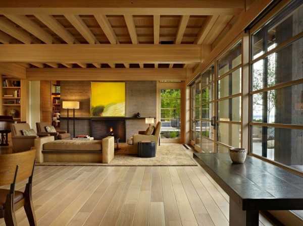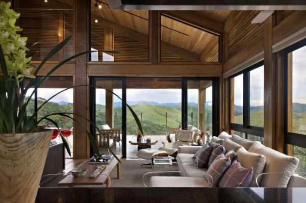 В интерьере гостиной с панорамными окнами часто присутствуют открытые балки стропильной системы