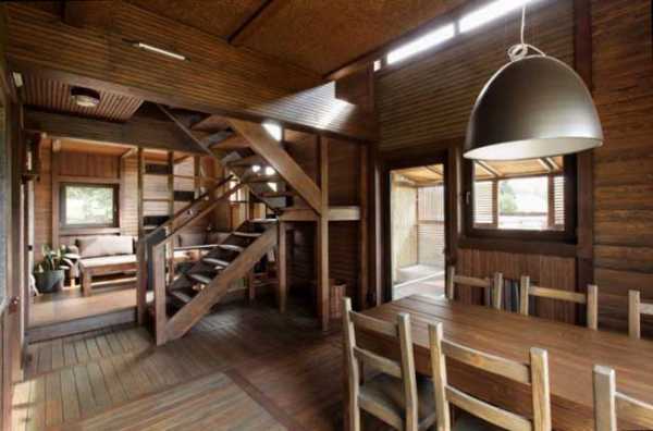 Данный дизайн дома из бруса полностью исключает наличие современных элементов отделки, таких как штукатурка, плитка или гипсокартон. Максимум, что требуется сделать, это покрыть деревянные стены дома лаком, для защиты от контакта с воздухом.
