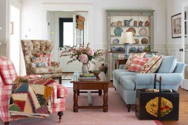 Простой фермерский стиль жителей северной Америки, в декоре изобилуют шерстяные пледы, и тканевые занавески, с незамысловатыми рисунками (клетка, горошек, цветы). Еще одной отличительной чертой интерьера дома из бруса считается цветовая палитра без использования ярких цветов, применяются только мягкие и теплые оттенки.