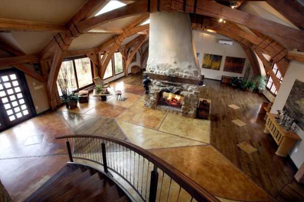 Напольное покрытие устилается доской, пропитанной темным составом. Стены могут оставаться из брусков, но их придется пропитать коричневым оттенком масла. Потолочное пространство, а именно этажные перегородки выполняются из огромных бревен деревьев, грубо отшлифованных.