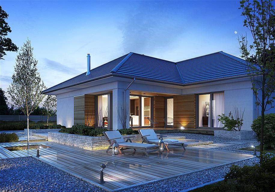 Фасад современного одноэтажного дома с гаражом. План одноэтажного дома. План одноэтажного дома с террасой.