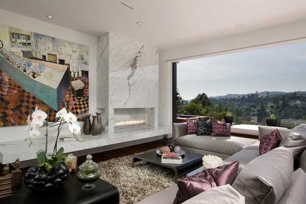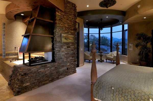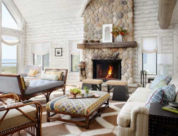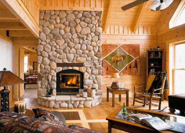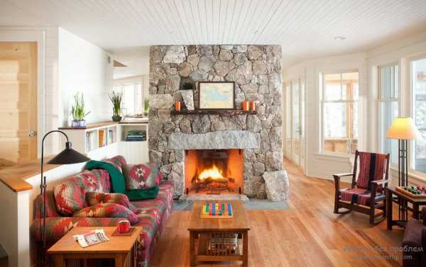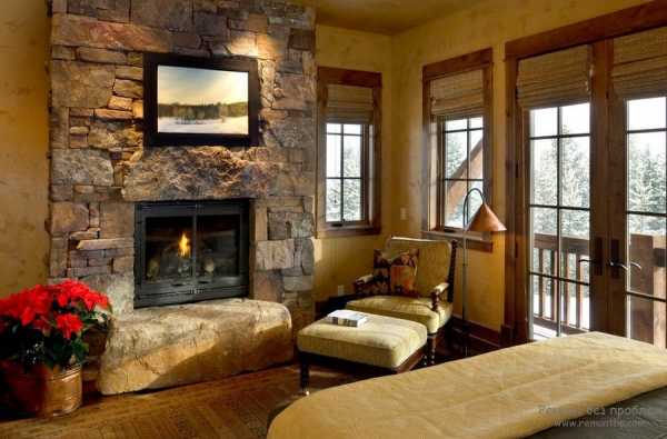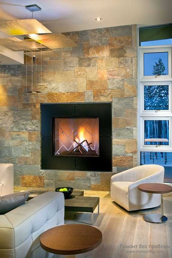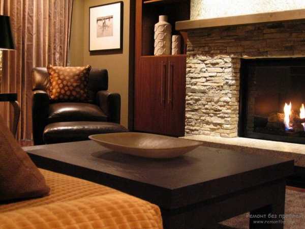 В какой бы комнате не находился камин, по правилам оформления интерьера он должен занимать главное место и, соответственно, выделяться на основном фоне. Поэтому дизайнеры советуют облицовывать его декоративным камнем, чтобы скрыть грубую кирпичную кладку (если это не вписывается в стиль помещения) и придать необходимый цвет зоне. Ниже показано, как сморится камин из камня в интерьере гостиной на фото.