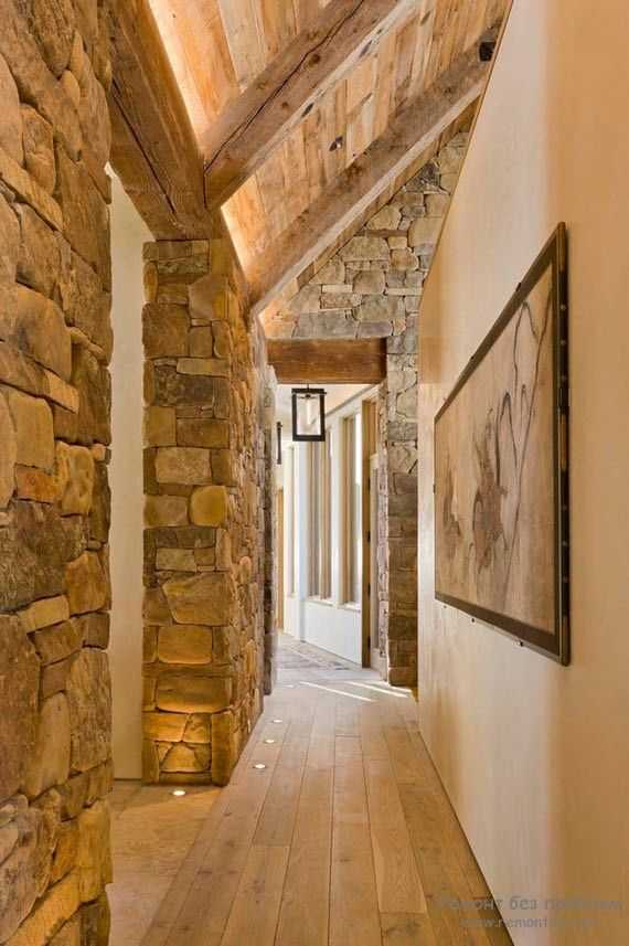 Используя дикий камень, фото которого вы увидите ниже, можно выделить необходимую стену в комнате – на ней, например, будет висеть телевизор. Либо можно просто задекорировать стены в прихожей под общий стиль помещения.