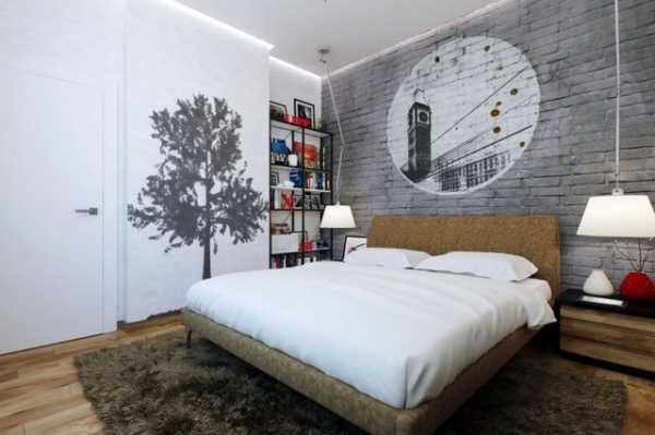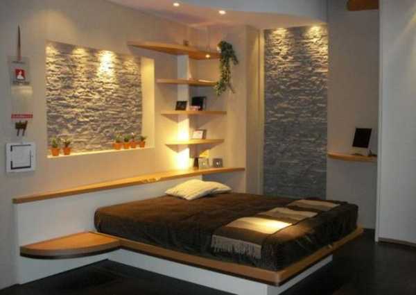 В этой комнате главное место занимает кровать. Зону отдыха также можно выделить, облицевав стену за кроватью, либо сделать из кирпичной кладки подиум для матраца, обложив его декоративным камнем. Это и будет служить кроватью. Такой способ оформления подойдёт спальне в стиле авангард, кантри, эко.