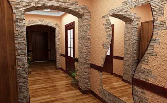 Как уже говорилось ранее, в коридоре достаточно просто отделать стены от пола до середины стены или чуть ниже. Также можно оформить дверные проёмы и углы. Ещё один вариант – выполнить отделку зеркала в прихожей с помощью декоративного камня.