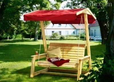 Качели, расположенные на улице, часто оборудуют навесом, который служит защитой от солнца (дождя) и одновременно является интересным декором