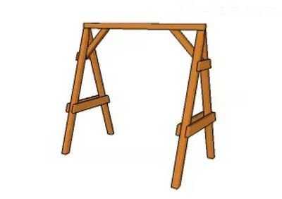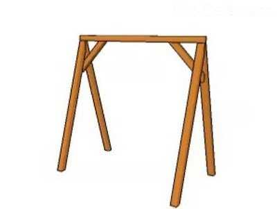 Внешне конструкция выглядит так: две стойки в виде буквы «А», соединенные верхней перекладиной. Для начала важно высчитать угол соединения вертикально стоящих деталей. Чем больше ширина предполагаемого сидения, тем шире должны быть расставлены стойки. Брусья (или столбы) скрепляют в верней части при помощи болтов – для надежности.
