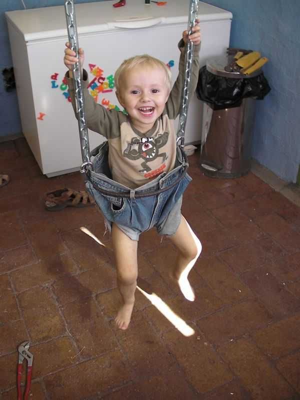 Покупать готовые качели для дома не имеет смысла, если руки растут из правильного места, нужно делать самим по примеру автора, изготовившего гениально простейшие и по сути бесплатные качели для своего непоседы.