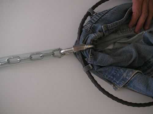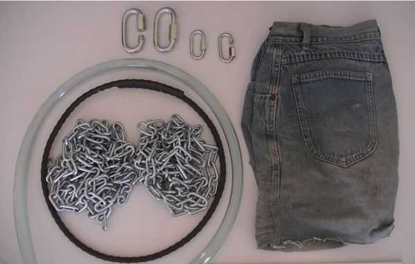 А именно как видно на фото были взяты старые джинсовые шорты, цепь, карабины и из этих нехитрых материалов сами прекрасно видите что получилось.