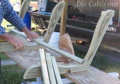 Выбрав необходимый угол соединения спинки и сидения, следует объединить детали в раму и поочередно зафиксировать планки, делая одинаковые интервалы между ними. Сначала крепятся концы деталей, затем – середина.