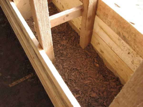 - Засыпка опилками или керамзитом. Для этого на каркасе делается несъемная опалубка из обрезной доски, в которую и засыпается утеплитель.