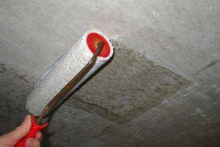 - Основание следует прогрунтовать для улучшения адгезии и стабилизации влагопоглощения. Грунтовать потолок можно как валиком, так и щеткой.