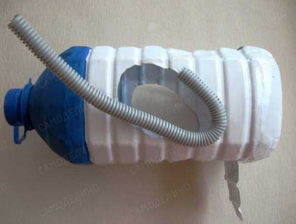 Приведем еще несколько вариантов создания кормушек из подручных средств. К примеру, обыкновенная бутылочка из-под минеральной или газированной воды в считанные минуты может превратиться в полноценную «столовую» для птиц. Действуем по стандартной схеме: вырезаем в емкости большое отверстие, насыпаем на дно зерно и проделываем дырочки в верхней части тары для продевания веревки. Чтобы леток получился ровным, рекомендуется предварительно нанести соответствующую разметку при помощи маркера. Края отверстия необходимо заклеить изолентой, дабы птицы не поранили лапки об острые пластиковые края (фото).