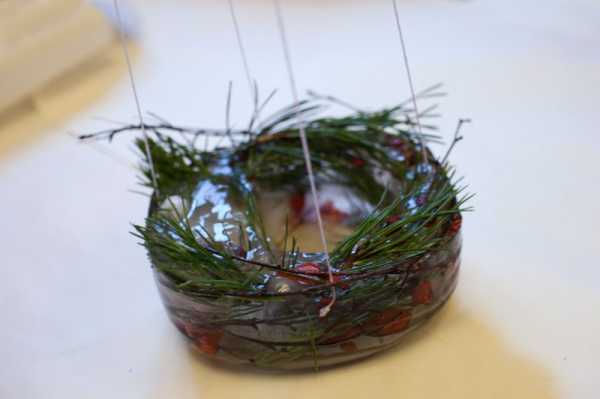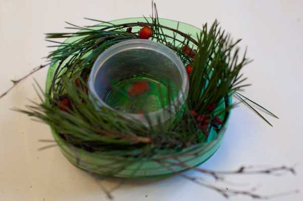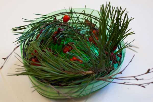 Заливаем дно бутылки водой и кладем ветки, ягоды, семечки. Укладывайте веточки по кругу так, чтобы между иголками оставалось свободное место, куда будет засыпаться прикорм.