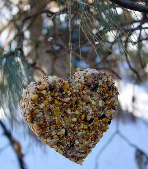 Такую кормушку можно изготовить из различных злаковых и желатина. Для этого вам понадобиться желатин, который нужно растворить на водяной бане, насыпать в него зерно, чтобы получилась густая масса, разложить по формочкам (можно использовать небольшие формы для выпечки или подсвечники), не забыв положить туда и нитки, за которые можно будет подвесить кормушку к дереву, и отправить в холодильник для застывания. Для удобства, можно также сделать небольшое отверстие в приготовленной массе, через которое будет продеваться нитка для подвешивания кормушки.