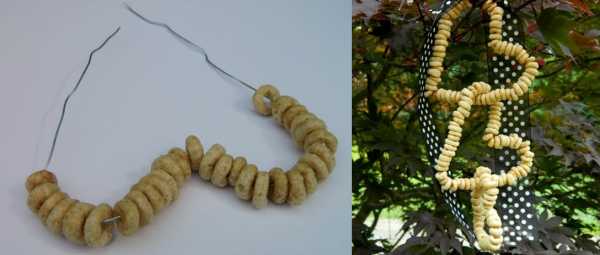 Мужно также купить злаковые завтраки (в виде колечек), которые следует нанизать на проволоку, изогнутую необычным способом (в форме круга, сердца или звезды).
