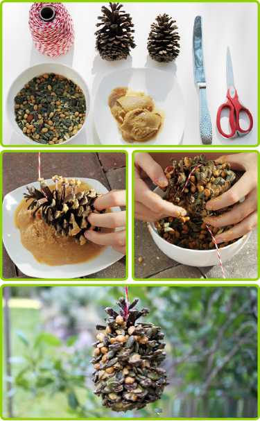 Кормушка из шишки: арахисовым маслом намажем шишку, и посадим на него зернышки для птичек.