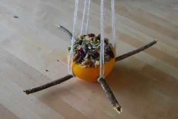 Чтобы кормушку можно было повесить, необходимо заранее продумать способ крепежа. Можно использовать толстые нити (к примеру, бечевку), концы которых окунуть в воду — они замерзнут и надежно удержат вес кормушки.