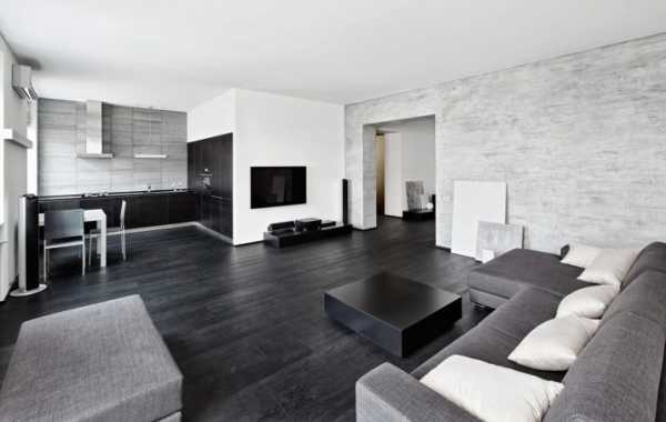 В современных интерьерах интересно смотрится контраст темного пола и белых потолков, а также других светлых поверхностей. Можно положить черный паркет, ламинат и поставить белый кожаный диван. Идеальный глянец пола будет подчеркивать белизну других элементов композиции.