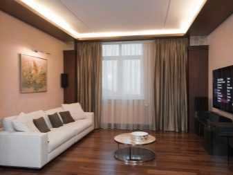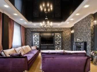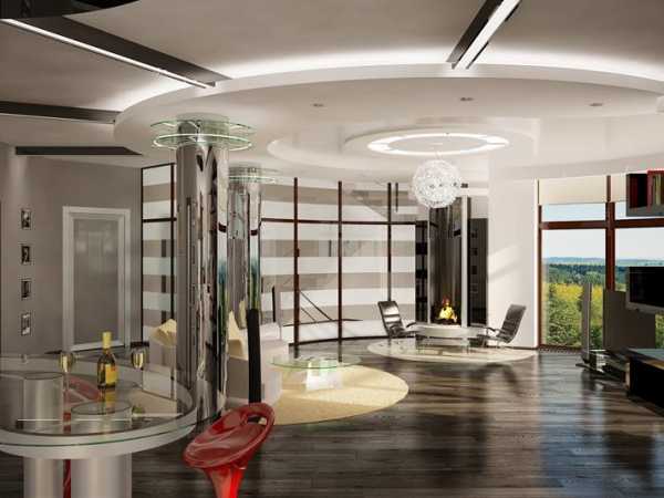 Что касается потолка, то в современных залах он может представлять собой объемные многоуровневые конструкции, карнизы. В них часто включают интересную подсветку, которая позволит также провести зонирование.